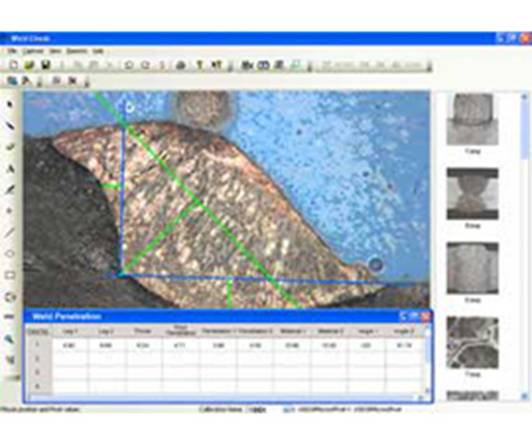 Weld Penetration Analysis Software-Model Weld Check Weld Check software is a powerful easy-to-use tool that enhances your ability to quickly and efficiently handle your most critical welding measurement and documentation software needs. Your workflow and productivity are greatly improved. Weld Check has been designed with your welding cross-section measurement needs in mind. Weld Check’s measurement module allows you to quickly measure such items as your fillet welds, throat, leg lengths and penetration. Use Weld Check Measurement Tolerance indicator to improve performance by having the software automatically tell you if a measurement is out of the tolerance range. The following report concerns the analysis of a fillet weld, a weld of approximately triangular cross section joining two surfaces at approximately right angles to each other. Important measurements made by the distance from the root if the fillet to the center of the face (or throat), the distance from the root of the joint to the junction between the exposed surface of the weld and the base metal (or leg), the angles and the root penetration. Measurements that could have been done with the same ease or similar sample are among others : depth of HAZ (heat affected zone), area of HAZ, joint penetration, phase counting, etc. The measurement remain uneffected if the image is zoomed for better accuracy. T he magnifier tool is also available which can be switched on any part of image. The tool zooms only the region surrounding the cursor allowing to increase the drawing precision while still seeing the whole sample. Image analysis system can measure a sequence of specific characteristics or welded parts. The system brings the good tool with the good color when it’s the time for the operator to use it. |